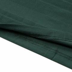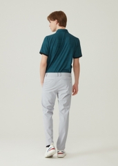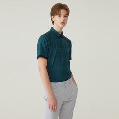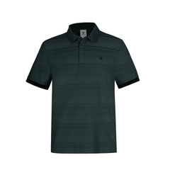 Chiếc áo trong hình là một chiếc polo nam tay ngắn có thiết kế hiện đại và năng động. Áo có màu xanh ngọc đậm làm nền, với các sọc nhỏ màu trắng chạy ngang thân áo, tạo nên vẻ ngoài tinh tế và trẻ trung.Viền tay áo được may bằng vải đen, mang lại điểm nhấn tương phản mạnh mẽ và phong cách thể thao. Áo có hàng khuy bấm ở phía trước, cùng logo nhỏ màu đen thêu ở ngực trái, thể hiện sự tối giản nhưng vẫn nổi bật.